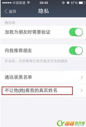 4、下面,在其隐私界面找到不让他看我的真实名字,点击进入