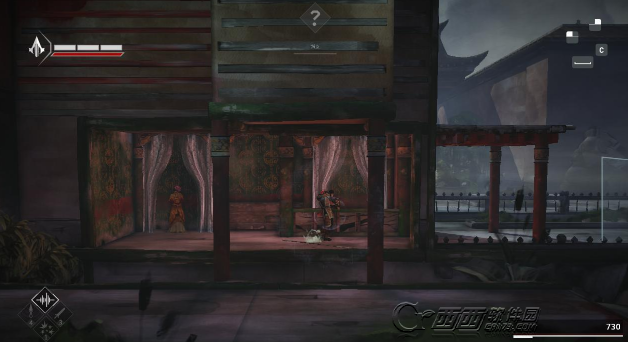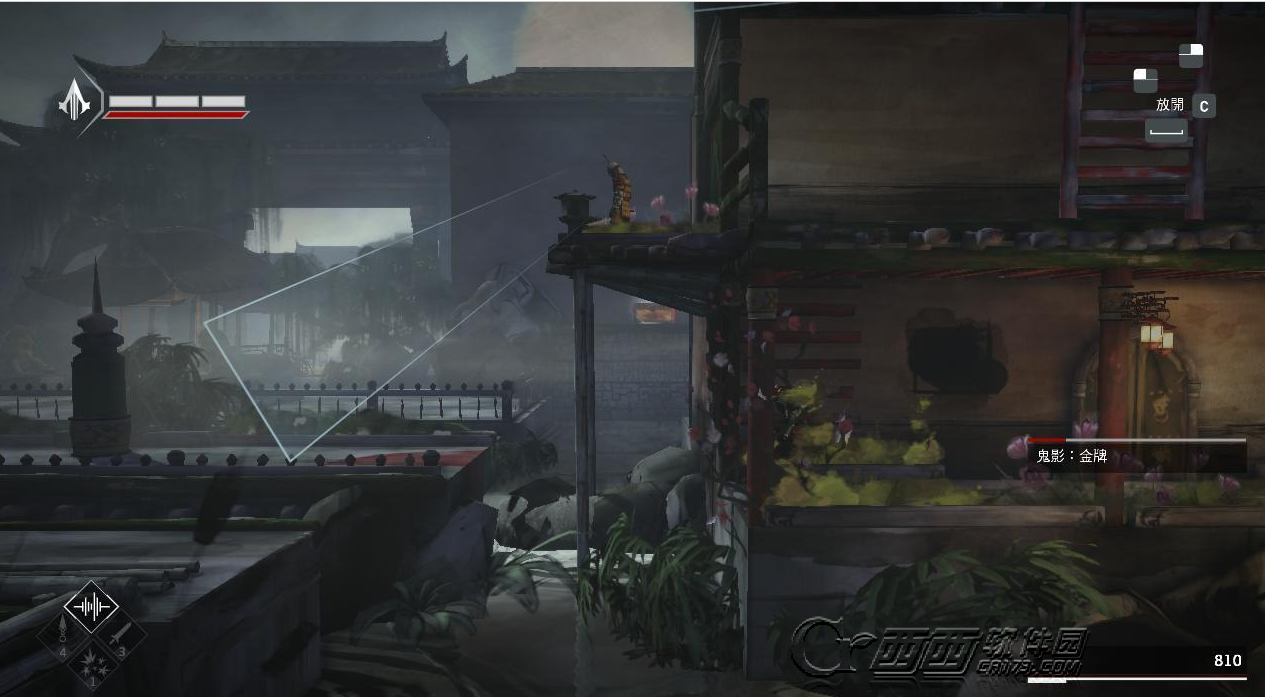 前面需要拯救一个嫔妃,并且有三个敌人,从墙壁上悄悄过去。