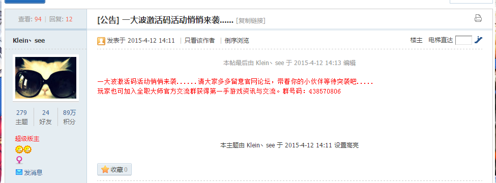 近期全职大师官方平台发布了一篇“一大波激活码活动悄悄来袭.....”的帖子,虽然该帖没具体说明详细的获得办法,不过一定是需要玩家在平台签到肯定时间才有抢码的机会的,另外帖子也发布了全职大师官方的一个粉群,在这里你可以获得游戏的最新资讯,当然也包含激活码,有兴趣的玩家可以试一试。