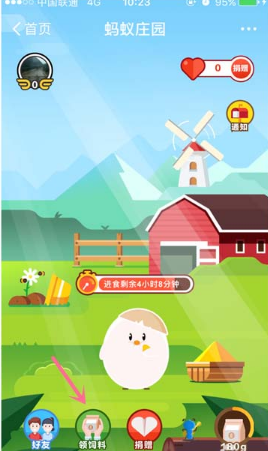 2、进入蚂蚁庄园之后,大家点击“领取饲料”来看看有什么方法来获得饲料。