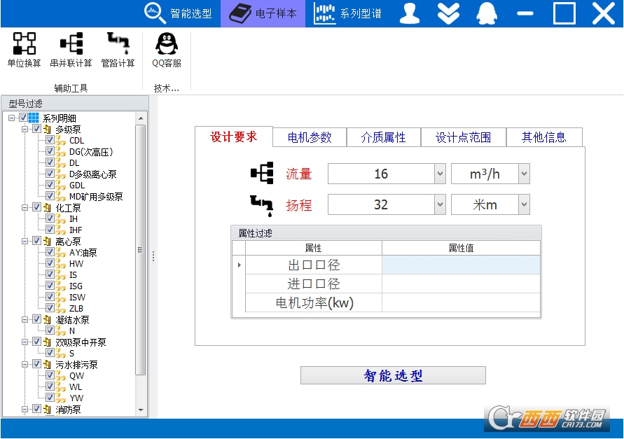 由上海义维为长沙中联泵业开发的单机版水泵选型软件,里面只包括长沙中联泵业商品,水泵选型软件依据流量、扬程选择泵的适合用范围与结构、依据动力源提供,选择驱动动力、依据作用与功效选择泵的结构(清水泵、消防泵、污水泵等)。主要功能包含:商品选型,电子样本,系列型谱,安装图,选型报告等。