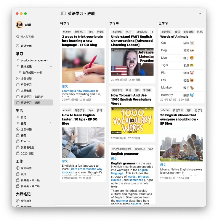 看板是大师笔记管理笔记的一种有效方法(另一种方法是搜索)。在看板中,笔记以卡片的形式,归类在特定的标签下