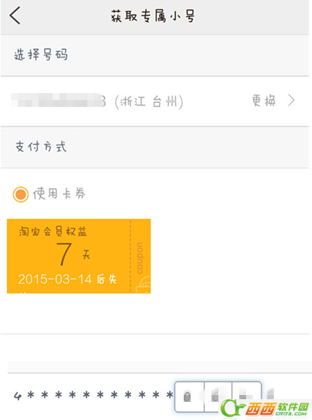 6、获得专用小号界面有一个支付方法,选择卡券支付(注意卡券的有效期),没卡券就只能用支付宝购买了。选择完成后,点击确定。进入支付宝实名校验。
