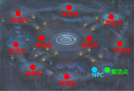 地图左侧中台为安全复活区,此区有NPC地宫传送,可通过与他对话选择传送到其他地方。